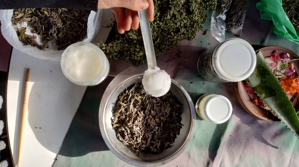 Multi-purpose ointment. For massage, acné, sun burns, psoriasis and eczema. Base of organic coconut oil, Tulsi oleate, organic non filtered bee wax and organic honey. This is going to be your skin’s best friend! The combination of this two sacred elements, tulsi and coconut, will fill your body with benefits: antioxidant, regenerative, and anti-inflammatory power.
